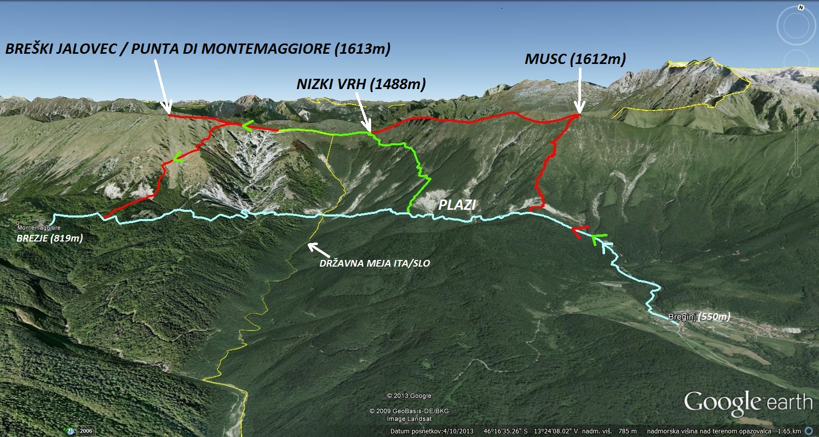 Ob 7.00h: Breginj – Musc – Breški Jalovec (ITA) – Brezje (ITA); čas hoje 6h (zahtevna)
