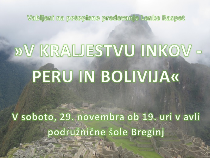 Nov 19 2014 potopisno predavanje »V KRALJESTVU INKOV – PERU IN BOLIVIJA« Lenka Raspet v sodelovanju s PD Kobarid odsek Breginj vabi na potopisno predavanje »V KRALJESTVU INKOV – PERU IN BOLIVIJA« Predavanje bo v soboto, 29. novembra, ob 19. uri v avli podružnične šole Breginj Vljudno vabljeni!