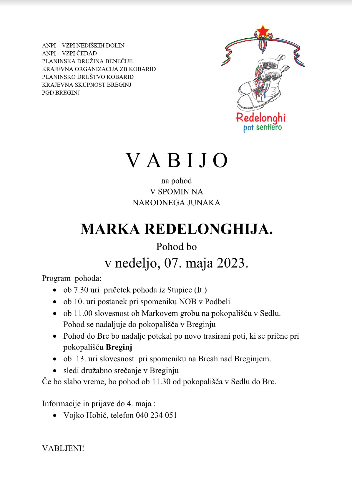 – ob 7.30 uri pričetek pohoda iz Stupice (It.) ob 10. uri postanek pri spomeniku NOB v Podbeli