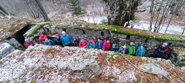 prehodili strelske jarke, kaverne, bunkerje. Z lučkami smo si osvetljevali pot med majhnimi kapniki in